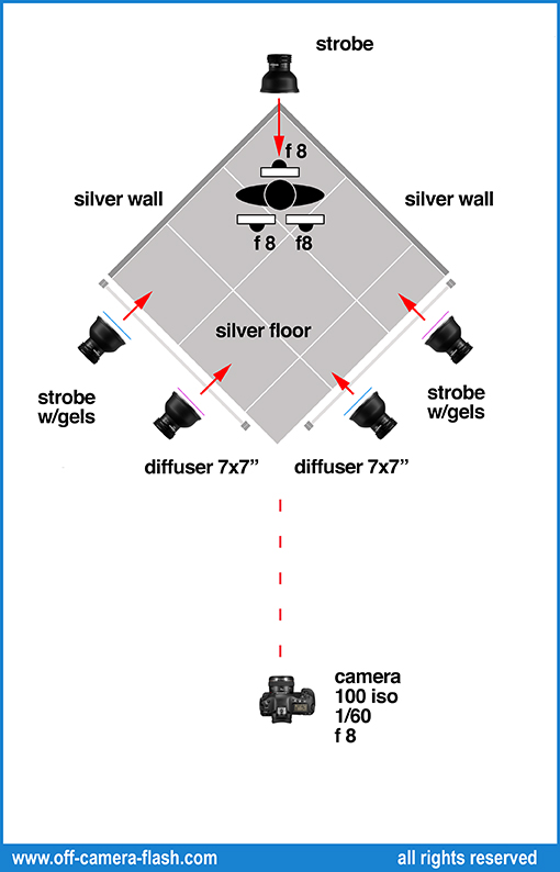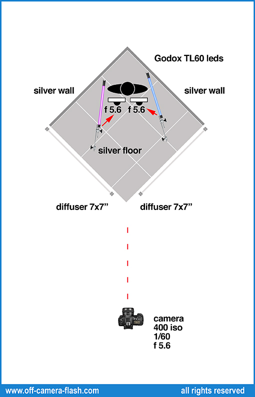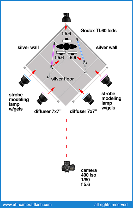 I decided to open up the shot a bit more and take some “American shot” photos. Since it was a set designed to reflect lights, I had to place more colored light points. Since I didn’t have any more led lights, I used the four-flash modeling lights.